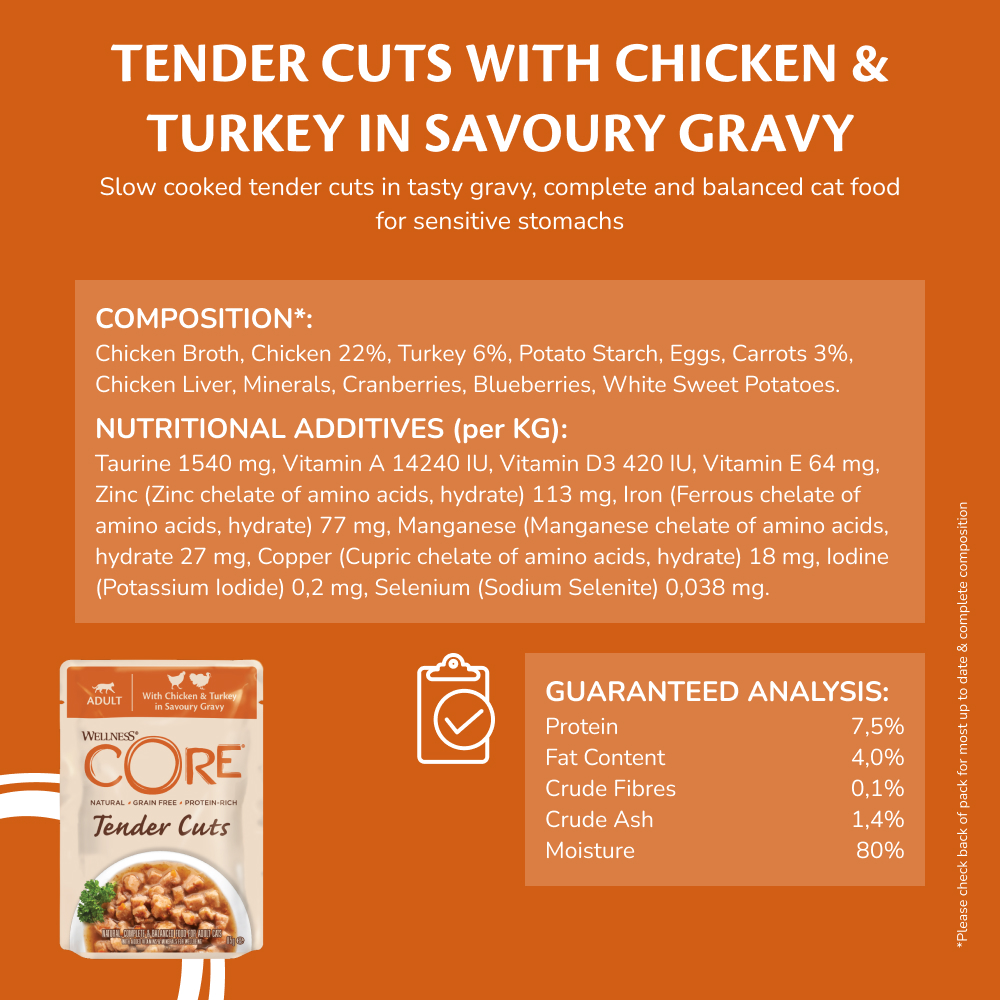 With taste in mind but health at heart: our Wellness CORE Tenders Cuts Kalkon Selection Multipack are grain free natural slow cooked tender cuts of poultry combined with healthy veggies and fruits served in savoury sauces that deliver an irresistible taste.